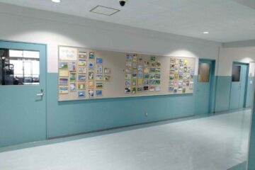 本校では、芸術活動を目に見る形で残したいと考えており、書道や美術も創作を行い広くアピールするため絶えず掲示をしております。是非、多くの方に芸術全体の活動を理解して頂きたいと考えております。写真は、第一、第二音楽室、書道室前、美術室前のものです。