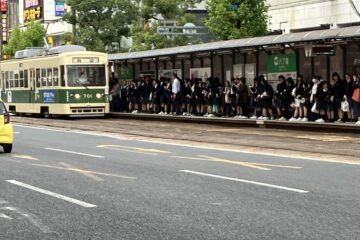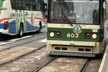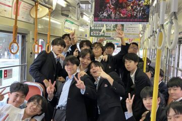 お好み焼きを食べた後は、貸し切りの広電に乗って、広島駅まで行きました。男女でそれぞれ1両ずつ。
