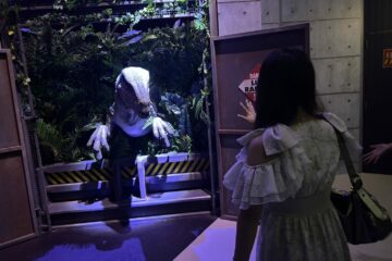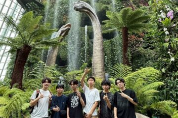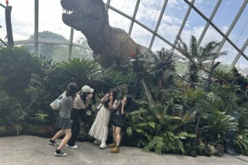 現在は映画『ジュラシック・パーク』との期間限定コラボが行われており、園内にはティラノサウルスやブラキオサウルスなど、迫力ある恐竜の模型が展示されています。未来的なスーパーツリーと恐竜の組み合わせは迫力満点で、まるで映画の世界に入り込んだような気分でした。色とりどりの植物や巨大な滝も見応えがあり、生徒たちは次々と写真を撮りながら楽しんでいました。