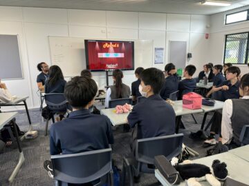 朝の復習テストの後は、チーム対抗の映画・アニメの名前当てゲームで大盛り上がり。優勝チームには、日本ではあまり見かけないティムタム(いちご味)が贈られ、笑顔が広がりました。