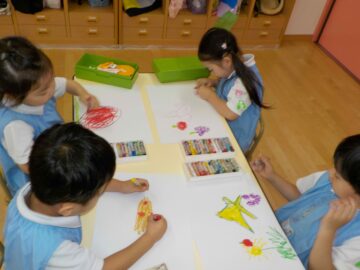 友だちと「何を描いてるの?」と話をしながら果物や家族、電車など楽しんで描くことが出来ました。