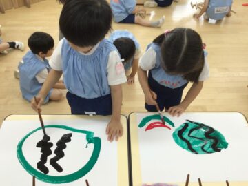 「黄色のスイカ、見たことあるよ」「種もたくさんあるよね」とお友だちとお話をしながら描く姿が見られました。