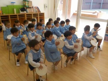 「この楽器は何だと思う?」と聞くと「タンバリン!」と名前を知っている子どもたちがたくさんいました。先生の動きを真似したりピアノの曲に合わせて叩いたりととても楽しかったですね。