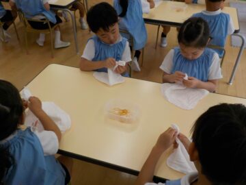 白く残したいところを輪ゴムできつく縛る作業は、完成を想像しながら自分の力で頑張っていたうめ組さん。