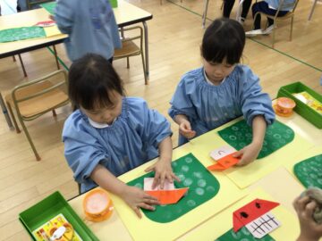自分で作ったぐるぐる模様のスタンプを押したり、折り紙で顔を折ったりして、素敵なししまいが完成して楽しかったですね。