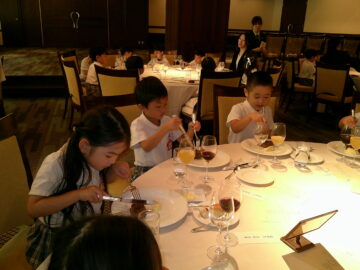 今日は年長組のみんなでシェラトン都ホテルに行き、ホテルのスタッフの方からテーブルマナーを学びました。