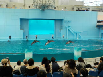 トレーナーさんたちと息を合わせて、泳いだり、手を振ったりしているイルカの姿を見て大喜び!