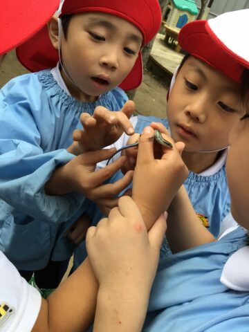 今日は自然がいっぱいある幼稚園のお砂場でトカゲを見つけました!