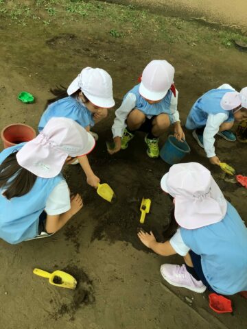 写真の2枚目は落ちているどんぐりを拾って、「埋めたら木になるかも!」とみんなで協力して埋めているうめ組さんたちの姿です♪