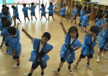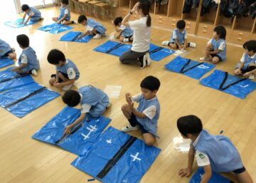 ひまわり組の青色の衣装にテープで好きなように模様をつけ、自分だけの衣装を作ったひまわり組さん。