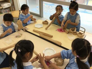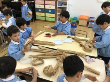 前日に年中組のお友だちに教えながら作った続きで、ドーナツの形にすることを頑張りました。