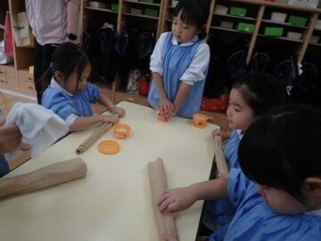 ドーナツの形を作る人、丸が崩れていないか確認する人、まとめて運ぶ人など、同じ机のお友だちと役割分担をしたので、無事に200個のドーナツができました!