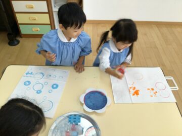 ブロックや洗濯ばさみ、ヤクルトなど身近な物をスタンプにしたので、「どんな形になるかな」とワクワクしていたもも組さん。