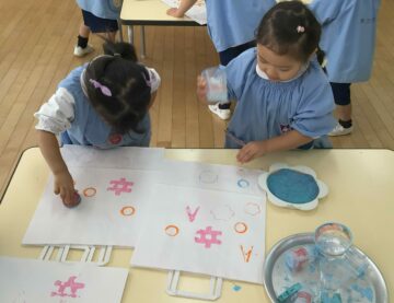今日は子どもフェスティバルのお買い物袋にスタンプを押しました。
