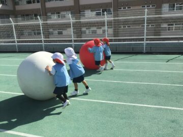 今日はひまわり組さんと一緒に屋上に行き、大玉転がしをしました。