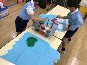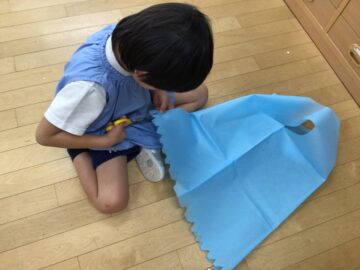 子どもフェスティバルのお店屋さんで使用するエプロン作りをしました。