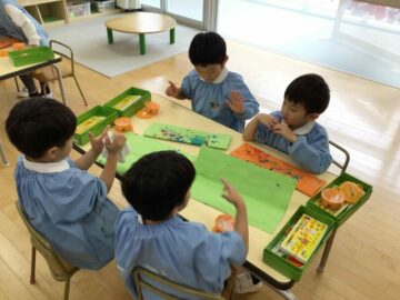 長い飴を入れるためにはどうしたら良いか、紙の向きや折る場所を考えて取り組んでいたひまわり組さん。