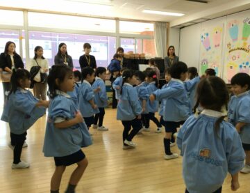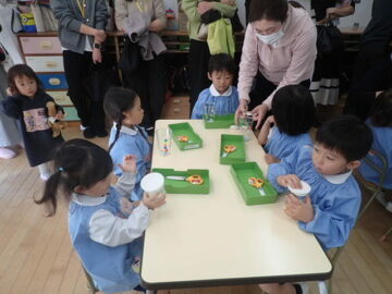 友だちと2人組になって「あくしゅでこんにちは」をしたり、コップでマラカスを作って演奏会をしたりして楽しみました。