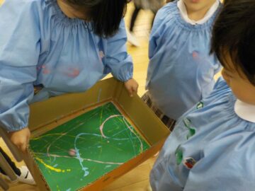 今日は、ビー玉に絵の具を付けて模様をつける「ビー玉転がし」を行いました。