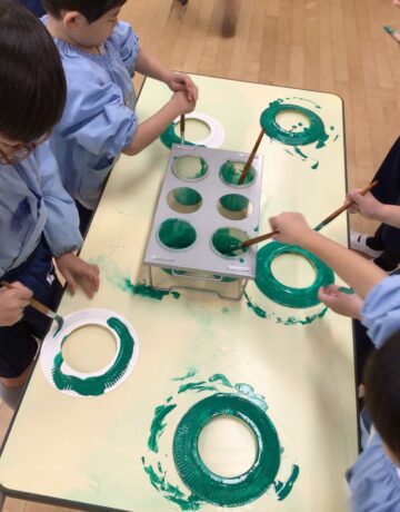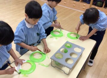 今日は、紙皿に絵の具で色を塗ってクリスマスリースを作りました。