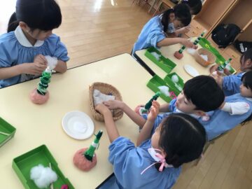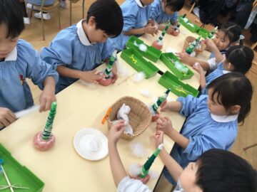ツリーの下に綿の雪を降らせたり、自分たちで一生懸命作ったリボンや星をつけたりして素敵なクリスマスツリーを完成させたきく組さん。