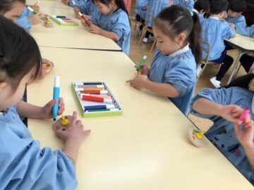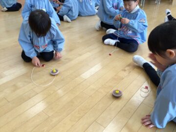 自分で色付けたオリジナルのこまに、真剣な眼差しでひもを巻いていたばら組さん。