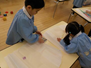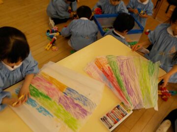 今日は凧にクレヨンでお絵描きをしました。大きな凧を見て驚いていたすずらん組さん。