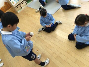 こまに紐を巻くことや回すことに苦戦している姿が見られました。