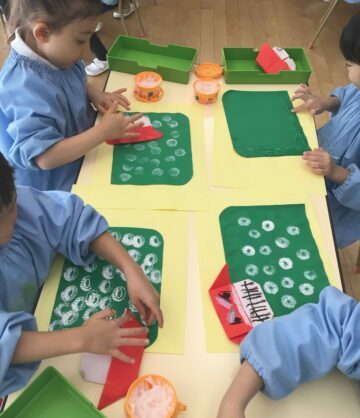 片段ボールを丸めて作ったスタンプもきれいな模様になりましたね♪