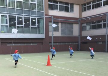 今日は凧に絵をかいて、園庭で凧あげをしました!