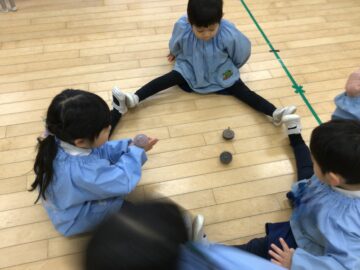 友だちと足で塀を作って競争を楽しんでいるすずらん組さん。