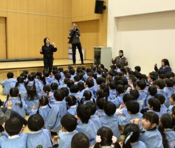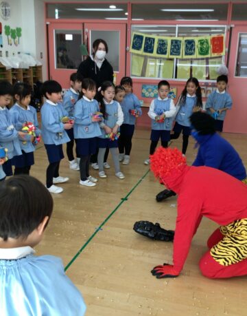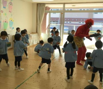 みんなでホールに集まり、節分の歌を歌ったり、クイズをしたりしていると突然赤鬼と青鬼がやってきて大暴れ。みんなの「おにはそと!ふくはうち!」という大きな掛け声で、鬼たちは逃げていきました。お部屋でも自分たちで作った豆入れに本物の福豆を入れて、鬼を追い払うことができましたね!