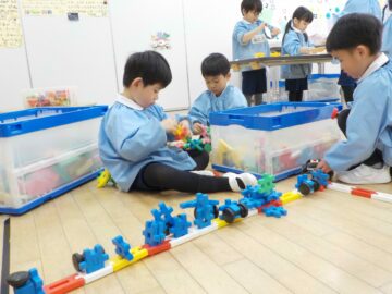 最近のもも組ではブロックで「ここをつなげよう!」など協力して、線路や電車を作って走らせて遊んでいる様子があります。