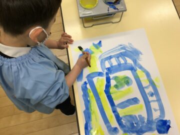 青、黄色の絵の具で自由画を行いました。初めて2色を使って描き始めると…