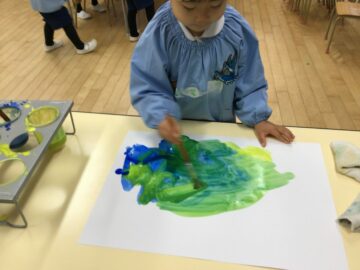 「あっ、色が変わった!」と緑色に変わったことを発見出来たすずらん組さん。大きな画用紙にたくさん描いて楽しかったですね。