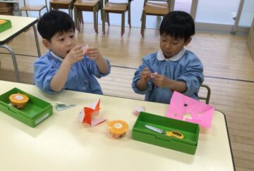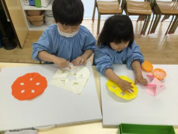 先週ハサミで切った切り紙に魔法をかけていた子どもたち。