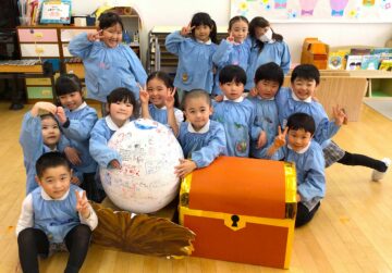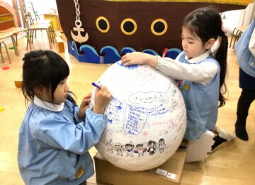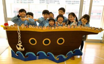 思い出作りとして、お遊戯会で使った船に、一人ひとりの顔を描いて貼ると、うめ組25人のお友だちと先生が乗っている船が完成しました!