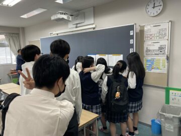 下の写真は放課後に貼り出されるその日の試験の模範解答と自身の解答を見比べる生徒の様子です。