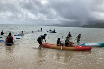 5分程度、船に乗ったら対岸のシークレットアイランドビーチに到着します。本校が貸し切っている状態なので、7クラスの生徒がのびのびと海遊びができました!