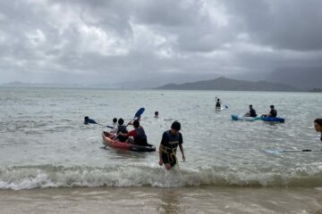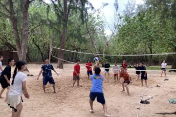 5分程度、船に乗ったら対岸のシークレットアイランドビーチに到着します。本校が貸し切っている状態なので、7クラスの生徒がのびのびと海遊びができました!