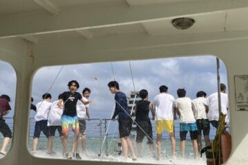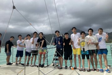 マリンブルーとエメラルドグリーンのきれいな海でのびのび、はしゃぎながら遊ぶ生徒の姿が印象的でした。
