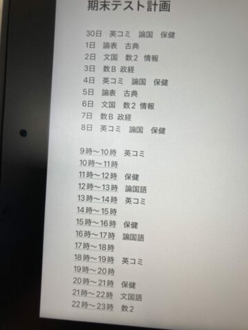 A. 試験1週間前には、具体的に時間で区切って計画を立て、iPadにメモしてます。(写真参照)