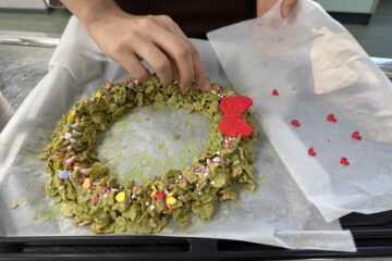 デザートには、ブッシュド・ノエルと、コーンフレークを抹茶チョコでコーティングしたリース風のお菓子を作りました。