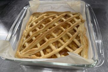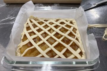 アップルパイでは、りんごの皮むきやカットに集中しました。大きさをそろえて切ることで、火の通りや食感が均一になることを学びました。
