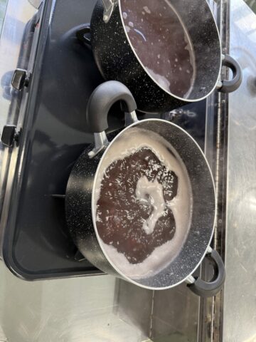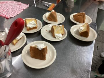 夕食は、野菜をたっぷり使ったタコライス、スープ、手作りあんみつ、シフォンケーキという豪華なメニューでした。あんみつは、あんこや黒蜜も一から手作りし、見た目も味も大満足の仕上がりとなりました。