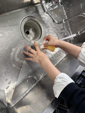 年度末の料理部では、1年間使用した調理室の大掃除を行いました。普段なかなか手が回らない排水溝の掃除では、「ぬるぬるして気持ち悪い!」と声を上げながらも、最後まで丁寧に取り組み、きれいに仕上げることができました。