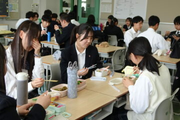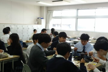 A. T.Tさん クラス内で、わいわい楽しく食べています。みんな、席を移動したり、椅子を持参して友達のところへいったり。
